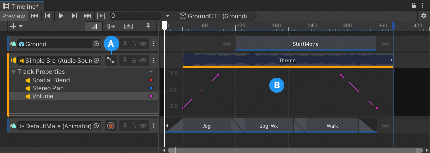## Curves view with Animation clips Use the Curves view to view and perform basic edits to animation curves in Infinite clips and Animation clips. These edits include adding keyframes, modifying keyframes, adjusting tangents, and changing the interpolation between keyframes. To view animation curves for an Infinite clip or Animation clip, enable the Curves View toggle in the Track Header. If you enable the Curves View toggle for an Animation track without selecting an Animation clip, the Curves view displays the animation curves for the first Animation clip. ![](images/tl-curves-anim-clip.png) _The Curves View toggle (A) displays or hides the Curves view for the selected Animation clip (B)_ ## View and edit in the Animation window The Curves View toggle does not appear for Animation tracks with imported animation. To view and edit keyframe animation for imported Animation clips, right-click an Animation clip and choose **Edit in Animation Window** from the context menu. You can also double-click the Animation clip. When the Animation window appears, it is linked to the Timeline window. When in linked mode, the Animation window displays the Linked button and the name of the Animation clip being viewed or edited. ![](images/anim-window-locked.png) _Animation window linked to the Timeline window, indicated by the Linked button and Animation clip name. The clip in this example is `(Read-Only)` which means that it can be viewed but not edited._ Click the Linked button to stop viewing or editing the Animation clip, and to release the Animation window from linked mode. You can also close the Animation window to release it from linked mode. ## Curves view with Audio tracks For Audio tracks, the Curves view displays the animation curves for the animatable properties of an Audio track. You can animate the following Audio track properties: * Spatial Blend * Stereo Pan * Volume Each animatable property is calculated based on its keyframe values, the values for each Audio clip, the values for each Audio source, or a combination of each. Consult [Audio track properties](insp-trk-audio.md) for more information on each animatable property. ![](images/tl-curves-audio-track.png) _The Curves View toggle (A) displays or hides the animatable properties of an Audio track (B)_ When you animate the properties for an Audio track, it is recommended that you select the Audio track, lock the Timeline window, and lock the Inspector window. With both the Timeline window and Inspector window locked, you can add and edit keyframe values with the Audio Track properties in the Inspector window. Use the Timeline Playhead, Playhead Controls, or keyboard shortcuts to navigate between keyframes.