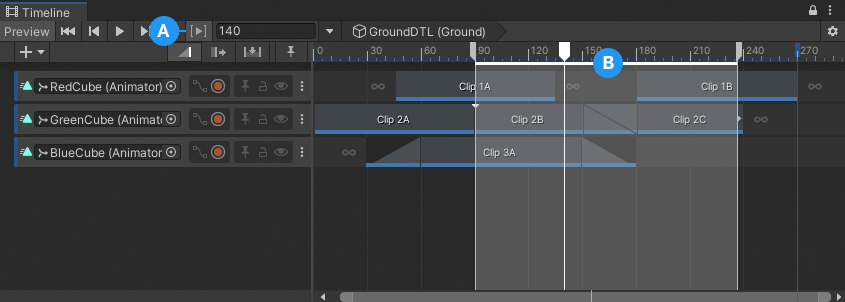 Enable the **Play Range** toggle to continuously loop playback within a specific range. You can only set a play range when previewing a Timeline instance within the Timeline window. Unity ignores the play range in [Play mode](https://docs.unity3d.com/Manual/GameView.html).