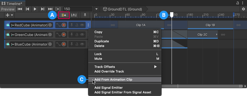 Accurately insert a clip with the Ripple mode (A), the Timeline Playhead (B), and Add From Animation Clip in the More (⋮) menu (C)