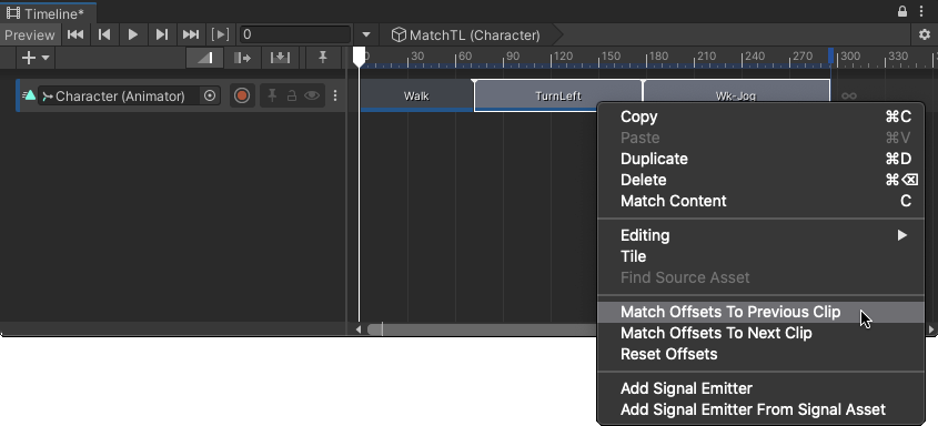 To match the clip offsets of many clips, select the adjacent Animation clips that you want to match and right-click one of the selected clips. From the context menu, select either Match Offsets to Previous Clip or Match Offsets to Next Clip.