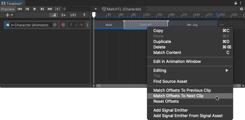 The context menu only displays the match options available for the selected Animation clip. For example, if the first clip, Walk is selected, only the Match Offsets to Next Clip menu item is available.