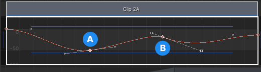(B) Keyframe with weighted tangents. Its tangent handles are drawn as outlines. In this example, the left and right tangents are set to different lengths.