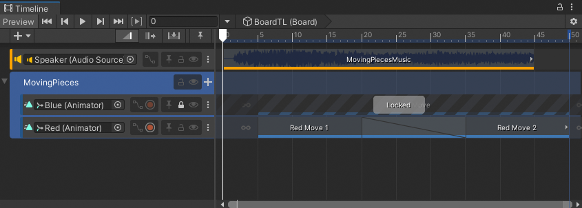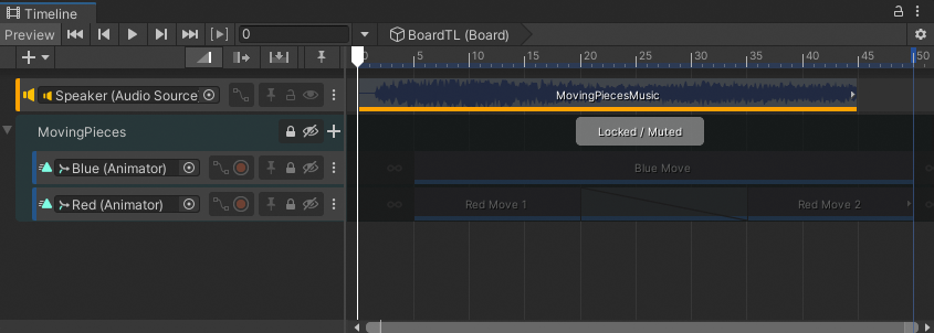 Use Track groups to organize tracks into groups when you are working with many tracks. For example, a Timeline instance has two Animation tracks that animate pieces to set up a game board. You can group these two tracks into a Track group named MovingPieces.