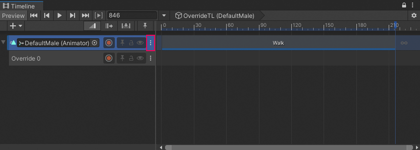 Notice that the Animation Override track is not bound to a GameObject. Because the Animation Override track is linked to the Animation track above, the Override track is bound to the same GameObject: the DefaultMale humanoid.