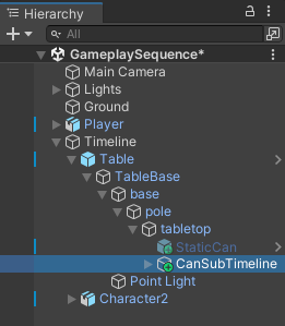 In this workflow, you want to nest the CanSubTimeline Timeline instance which is associated with the CanSubTimeline GameObject. This GameObject is within the Table hierarchy.