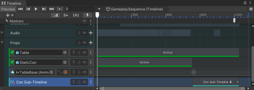 The Props Track group contains tracks that activate and animate the Table and Can GameObjects. The Props Track group also contains the Can Sub-Timeline Control track that nests the CanSubTimeline Timeline instance. This Timeline instance animates the Can GameObject as it bounces and falls off the table.