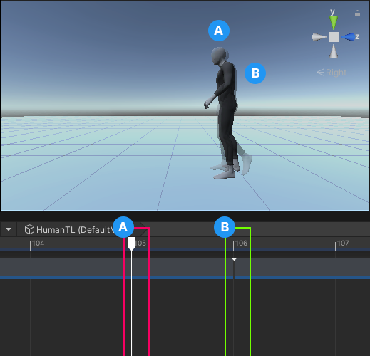 DefaultMaleat the start of theWalkAnimation clip, which starts at frame 106 (B), matches the position and rotation of theDefaultMaleat the end of theTurnLeftAnimation clip, which ends at frame 105 (A) -